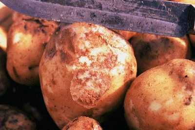 Late blight on potato tubers. Infected potato tubers exhibit wet and dry rots.