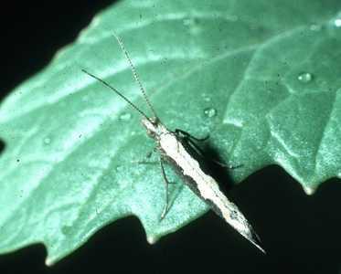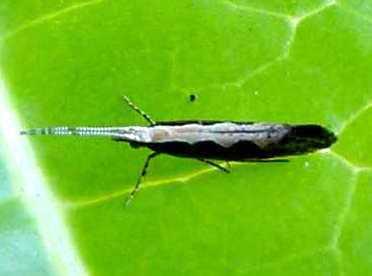 Diamondback moth adult. The adult is greyish brown with a 9 mm long body and a wingspan of about 1.2 to 1.5 cm