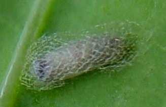 Diamondback moth pupal colour changes to brown before adult emergence. The developing moth can be seen through the cocoon. The pupa is 5 to 6 mm long.