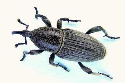 Banana Weevil Borer (Cosmopolites sordidus). Adults attain a body lenght of 1-1.6 cm and are black or very dark brown.