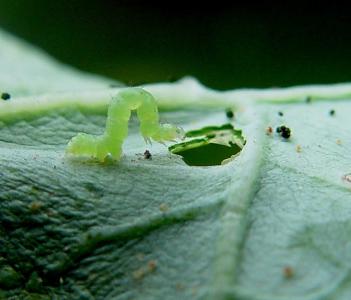 | Young cabbage looper feeding on a kale leaf. Mature caterpillar reaches 3 to 4 cm in length. |