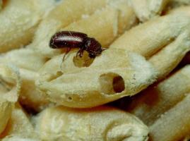 In later stages of infestation these beetles may also hollow out the grains. Pupation usually takes place within the eaten grain. The lesser grain borer is primarily a pest of cereal grains, other seeds, cereal products and dried cassava. It will be controlled by any method that controls the larger grain borer.