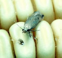 | Angumois grain moth on maize. The moth is small, pale brown, 5-7 mm long with wings folded, wingspan 1-1.6 cm |