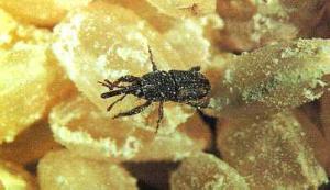 The adults are small (2.5 to 4.0 mm long), brown weevils with a long, narrow snout. Female lays eggs inside the grain. The larva (grub) lives and feeds inside the grain hollowing it out. The adult attacks whole or damaged grains causing irregularly shaped holes. Grain weevils attack grains either in the field before harvest or in the store. ![]() |