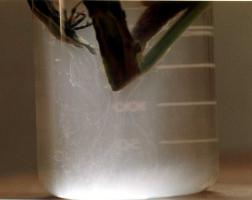 | Water test for detection of bacterial wilt. Note bacterial strands oozing from infected tissue. |