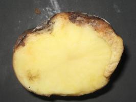 The infested leaves wilt during the (sunny) day and sometimes recover during cool hours. The wilting is similar to the result of lack of water. During the rapid development of the disease, the entire plant wilts quickly without yellowing. Other symptoms could be wilting of only a part of the stem, or one side of the leaf/stem. The stem wilts or dries up completely and the remainder of the plant remains healthy. When the diseased tuber is cut, it shows a browning of the vascular ring and the immediate surrounding tissues On the cut surface, a creamy fluid usually appears on the vascular ring. |