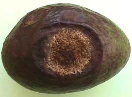| Anthracnose (Colletotrichum gloeosporioides) on avocado fruit. This fungal disease is primarily a post-harvest problem when fruit is at maturity stage. |