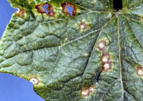 | Anthracnose (Colletotrichum orbiculare) damage to pumpkin leaf (Cucumis sativus). |