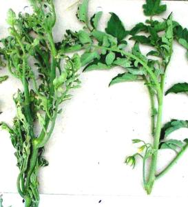 Leaves: stunting, bushy growth; reduced size; abnormal forms. Flowers: drop.