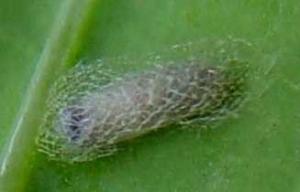 | Diamondback moth pupal colour changes to brown before adult emergence. The developing moth can be seen through the cocoon. The pupa is 5 to 6 mm long. |