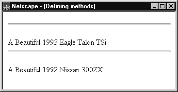 You can define methods for an object type by including a method definition in the object constructor function. For example, you could define a function that would format and display the properties of the previously-defined car objects; for example,