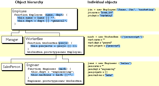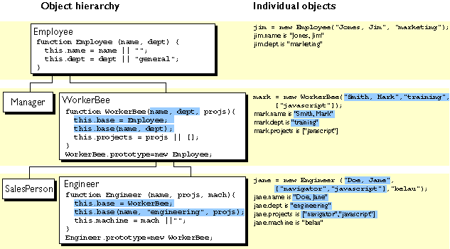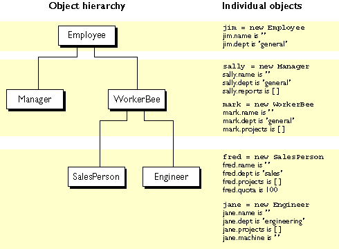 The Engineer and SalesPerson definitions create objects that descend from WorkerBee and hence from Employee. An object of these types has properties of all the objects above it in the chain. In addition, these definitions override the inherited value of the dept property with new values specific to these objects.