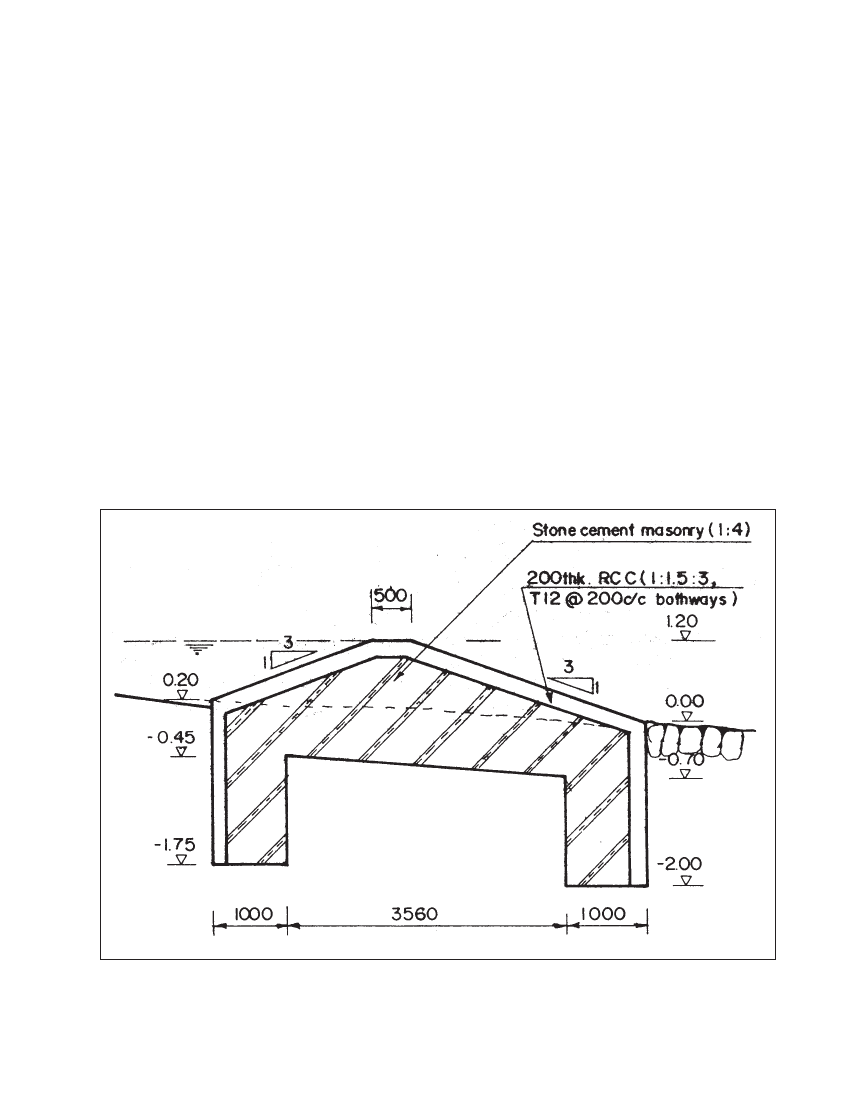 travel downstream through the weir and the RCC blanket helps to strengthen the weir surface against abrasion due to rolling boulders. Also note
