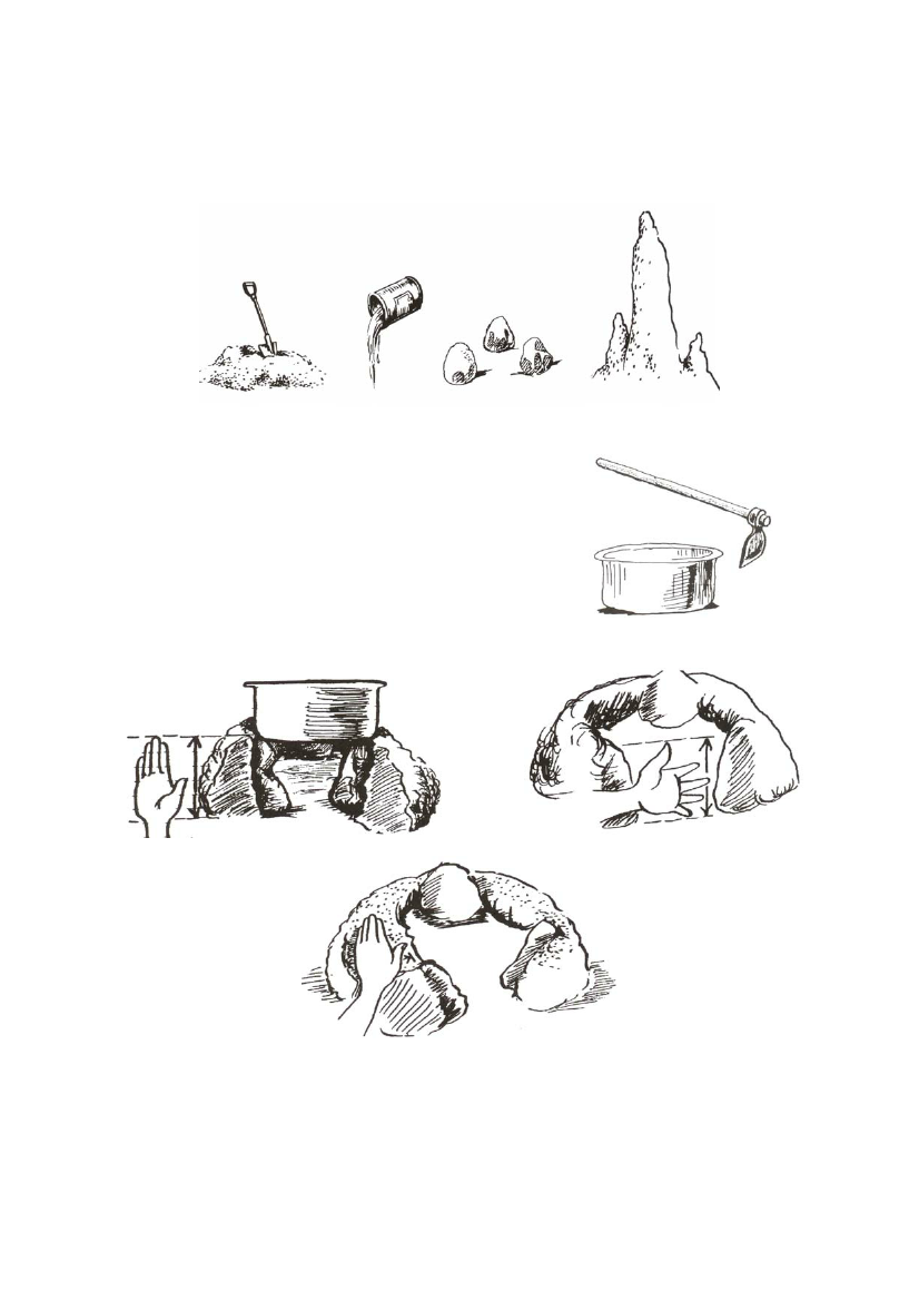 Three stones, sand, cow dung, clay, water, ant hill soil where there is no clay. Any other soil material
