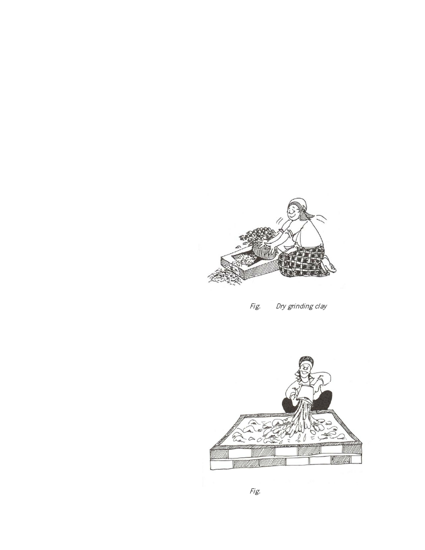 The clay is dug out, dry or wet, then broken up into small pieces and dried thoroughly. When dry, it is