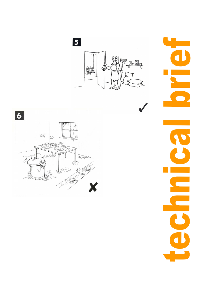 on floors, in drains or on work surfaces. Keep all wastes in covered bins and take them outside at