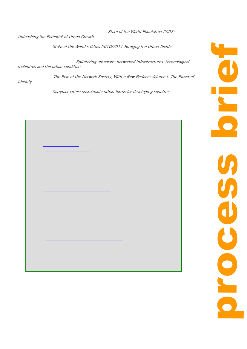 UN Habitat 2008. State of the World’s Cities 2010/2011 Bridging the Urban Divide. Earthscan.